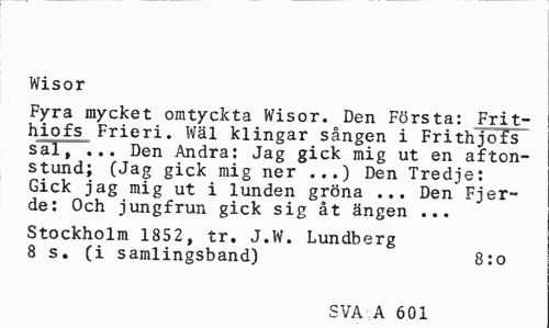 //// Wisor //// Fyra mycket omtyckta Wisor. Den Första: Frithiofs Frieri. Wäl klingar sången i Frithjofs sal, ... Den Andra: Jag gick mig ut en aftonstund; (Jag gick mig ner ...) Den Tredje: Gick jag mig ut i lunden gröna ... Den Fjer-de: Och jungfrun gick sig åt ängen ... //// Stockholm 1852, tr. J.W. Lundberg 8 s. (i samlingsband) 8:0 //// SVA A 601 ////