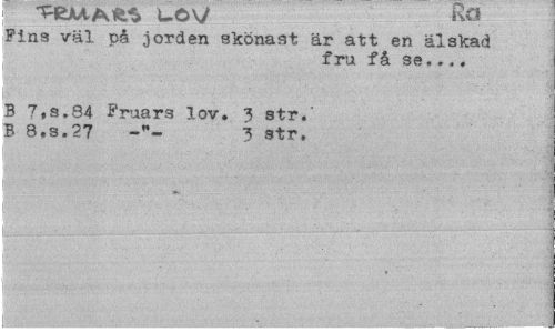 //// Pin3 väl på jorden skönast är att en älskad //// fru få se... //// B 7,s.84 Fruars lov. 3 str.' B 8.S.27 3 str. ////
