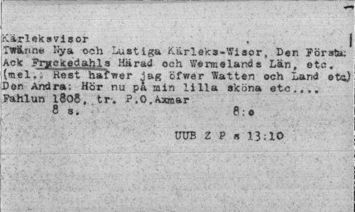 //// Kärlekavis or //// Twänntt Nya och Lustiga Kärl ek»-Wisor, Den Första; Ack Pmtekedahla Härad och Wermelands Län, etc. (mel.; Rest ha£wer jag öfwer Watten och Land etc) Den Andra; Hör nu på min lilla sköna etc... Fahlun 180$, t r. P.O.Axroar //// 8 s. 6;o //// UUB Z P « 13:10 ////