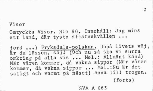 //// 2 //// Visor //// Omtyckta Visor. N:o 30. Innehåll: Jag mins ett land, där tysta stjärnekvällen ... //// jord ...) Fryksdals-polskan. Uppå livets väj, är du lässen, säj! (uch nu så ska vi surra omkring på alla vis ... Mel.: Allmänt känd) När våren kommer, då vakna sippor (När våren kommer, då vakna sippor ... Mel.:Nu är det soligt och varmt på näset) Anna lill trogen. //// (forts) //// QVA A Rfi-s; ////