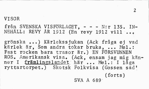 //// 2 //// VISOR //// från SVENSKA VISFÖRLAGET, --- N:r 135. INNEHALL: REVY ÄR 1312 CEn revy 1912 vill ... //// grönska ...) Kärlekssjukan (Ack fråga ej vad kärlek är, Som andra tokar bruka, ... Hel.: Fast rocken bara trasor är.) EN FÖRSVUNNEN ROS. Amerikansk visa. (Ack, ensam jag mig känner I främlings landet här ... Mel.: I låga ryttartorpet.) Skotsk Folkvisa (Gossen sad' //// (forts) //// SVA A 689 ////