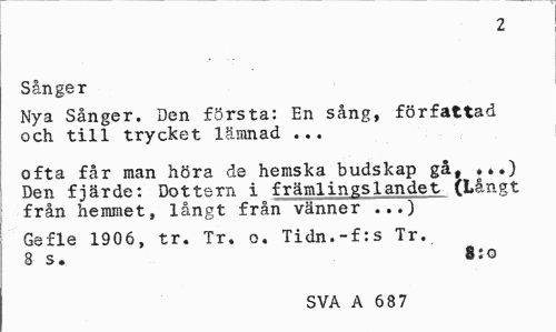 //// 2 //// Sånger //// Nya Sånger. Den första: En sång, författad och till trycket lämnad ... //// ofta får man höra de hemska budskap gå# *?.) Den fjärde: Dottern i främlingslandet (Långt från hemmet, långt från vänner ...) //// Gefle 1906, tr. Tr. o. Tidn.-f:s Tr. 8 s. 8:o //// SVA A 687 ////