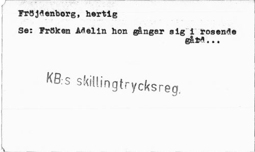 //// f " Fröjdenborg, hertig //// Se: Fröken Adelin hon gångar sig i rosende //// gård.. * //// i //// | KB.s skillingtrycksreg. ////
