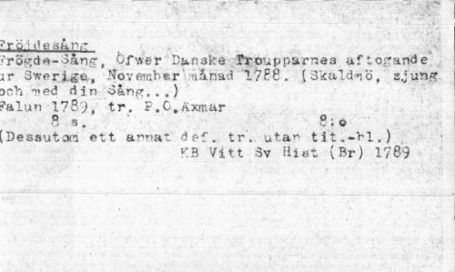 //// 'röi dosans //// 'rogdft-oång, Ofwer Danske froupparnes uftorrande tr Swerlge, November n&nad "1788 . ( Skaldaö, sjung >ch med din o&ng.,,) ¦alun 1789, tr. F.C.äxmar //// 8 s. 8;o //// Dessutom ett annat d ef. tr. uta^ tit.->l.) //// v.3 Vitt Sv Hi61 (Br) 1789 ////