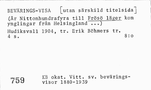 //// BEVÄRINGS-VISA [utan särskild titelsida] //// (Ar Nittonhundrafyra till Frösö läger kom ynglingar från Helsingland ...} //// Hudiksvall 1904, tr. Erik Bchmers tr. 4 s. 8:0 //// kb okat. Vitt. sv. bevärings- //// (DV visor 1880-1939 ////
