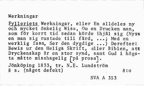//// Werkningar //// Fylleriets Werkningar. eller En alldeles ny och mycket Ömkelig IV i sa, Om en Drucken man, som för korrt tid sedan körde ihjäl sig (Nyss en man sig rustade till färd, Med en //// werklig fasa, Ser den dygdige ...) Derefter: Bewis ur den Heliga Skrift, eller Biblen, att Dryckenskap är en stor synd, samt Gud i högsta måtto misshagelig £på prosa^J. //// Jönköping 1833, tr. N.E. Lundström 8 s. (något defekt) 8:0 //// SVA A 35 3 ////