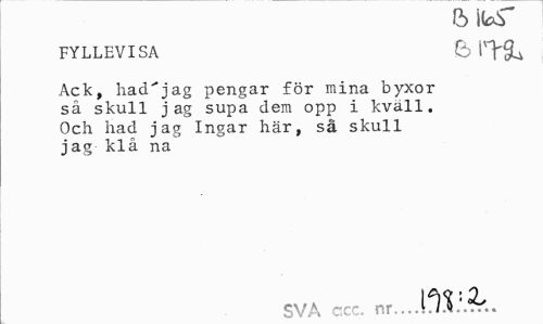 //// 6 I icS' //// FYLLEVISA B l^g^ //// Ack, had^jag pengar för mina byxor så skull jag supa dem opp i kväll. Och had jag Ingår här, sä skull jag klå na //// SVA ccc. nr... ////