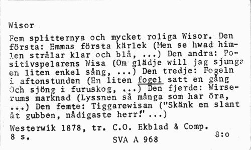 //// Wisor //// Fem splitternya och mycket roliga Wisor. Den första: Emmas första kärlek (Hen se hwad himlen strålar klar och blå, ...) Den andra: Positivspelarens Wisa (Om glädje will jag sjung? en liten enkel sång, ...) Den tredje: Fogeln i aftonstunden (En liten fogel satt en gång Och sjöng i furuskog, ...) Den fjerde: Wirse-rums marknad (Lyssnen så många som har öra, ...) Den femte: Tiggarewisan ("Skänk en slant åt gubben, nådigaste herr/' ...) //// Westerwik 1878, tr. C.O. Ekblad & Comp. //// 8 s* SVA A 968 3:0 ////