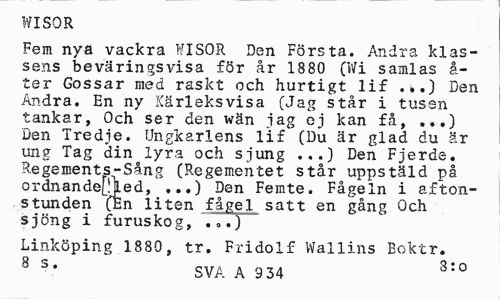 //// WISOR //// Fem nya vackra WISOR Den Första. Andra klassens beväringsvisa för år 1880 (Wi samlas å-ter Gossar med raskt och hurtigt lif .».) Den Andra. En ny Kärleksvisa (Jag står i tussn tankar, Och ser den wän jag oj kan få, ..,) Den Tredje. Ungkarlens lif (Du är glad du är ung Tag din lyra och sjung ...) Den Fjerde. Regements-Sång (Regementet står uppstäld på ordnande[lled, ...) Den Femte. Fågeln i aftonstunden (En liten fågel satt en gång Och sjöng i furuskog, ...)" //// Linköping 1880, tr. Fridolf Wallins Boktr. 8 S* SVA A 9 34 8:0 ////