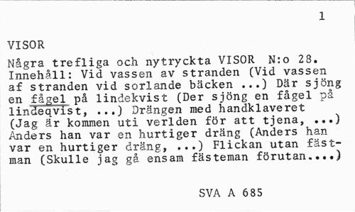 //// 1 //// VISOR //// Några trefliga och nytryckta VISOR N:o 28. Innehåll: Vid vassen av stranden (Vid vassen af stranden vid sorlande bäcken ...) Där sjöng en fågel på lindekvist (Der sjöng en fågel på lindeqvist, ...) Drängen med handklaveret (Jag är kommen uti verlden för att tjena, ...) Anders han var en hurtiger dräng (Anders harvar en hurtiger dräng, ...) Flickan utan fästman (Skulle jag gå ensam fäs teman förutan,...) //// SVA A 685 ////