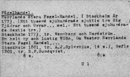 //// Herrhand8 3Tara Fogel-Handel, I Stoekhclm År 1773. (Ett tuaerni sjuhundrade sjuttie tre Sig Tjädrar och Orrar,,, mal.i Ett tu«erni sjuhundra» de Sextie tre.) //// Stockholm 1773, tr. Wennberg och Kordström. En helt ny och lustig WISA, Om Wester Norrlands Stora Fogel Handel,.., //// Stockholm 1801, tr. A.J.Sylvenius, (4 s.), Gefle 1801, tr. E.P.Sundqviat. //// 8 s. 8; • //// ' & 1 ////