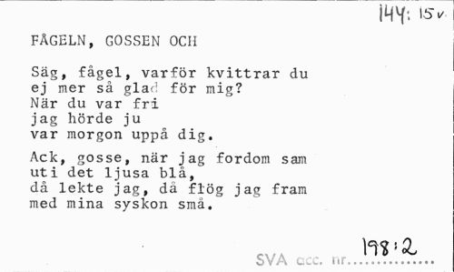 //// I HT- //// FÅGELN, GOSSEN OCH //// Säg, fågel, varför kvittrar du //// ej mer så glad för mig? //// När du var fri //// jag hörde ju //// var morgon uppå dig. //// Ack, gosse, när jag fordom sam uti det ljusa blå, då lekte jag, dä flög jag fram med mina syskon små. //// m! x //// SVA i./... ////