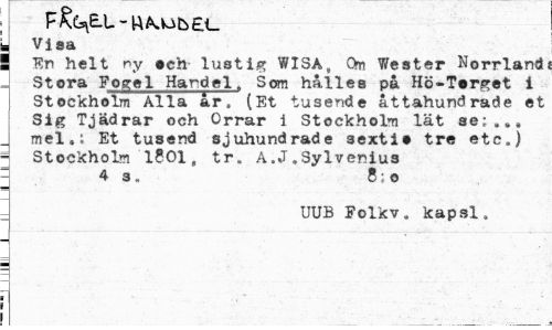 //// . Visa //// i En helt ny »en- lustig WISA, Om Wester Norrland Stora Fogel Handel» Som hålles på Hö-Terget i Stockholm Alla ar, (Et tusende åttahundrade et Sig Tjädrar och Orrar i Stockholm lät ae; mel,: Et tusend sjuhundrade 3exti• tre etc.) //// - Stockholm 1801, tr. A.J.Sylvenius //// - 4 3. 8;o //// UUB Folkv„ kapsi. ////