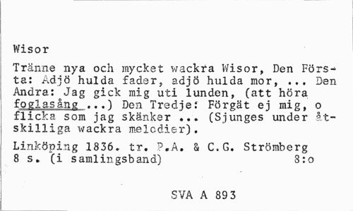 //// Wisor //// Tränne nya och mycket wackra Wisor, Den Första: Adjö hulda fader, adjö hulda mor, ... Den Andra:^Jag gick mig uti lunden, (att höra foglasång ...") Den Tredjef Förgät ej mig, o flicka som jag skänker ... (Sjunges under åtskilliga wackra melodier). //// Linköping 1836. tr. P.A. 8, C. G. Strömberg 8 s. (i samlingsband) 8:o //// SVA A 89 3 ////