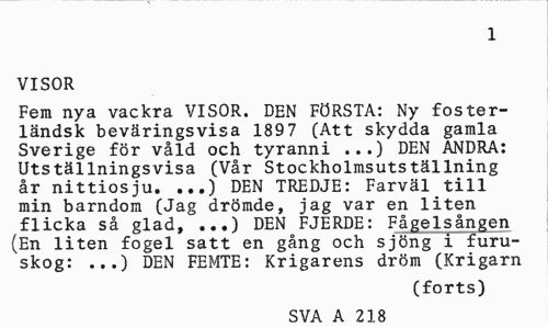 //// 2 //// VISOR //// Fem nya vackra VISOR. DEN FÖRSTA: Ny fosterländsk beväringsvisa 1897 (Att skydda gamla Sverige för våld och tyranni ...) DEN ANDRA: Utställningsvisa (Vår Stockholmsutställning år nittiosju. ...) DEN TREDJE: Farväl till min barndom (Jag drömde, jag var en liten flicka så glad, ...) DEN FJERDE: Fågelsången (En liten fogel satt en gång och sjöng i furuskog: ...) DEN FEMTE: Krigarens dröm (Krigarn //// (forts) //// SVA A 218 ////