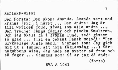 //// 1 //// Kärleks=Wisor //// Den Första: Den sköna Amanda. Amanda satt med kranns fsicj i håret ... Den Andra: Jag är till weflden född, såwäl som alla andra ... Den Tredje: Fånga fåglar och plocka Smultron, Och jag skall ga i grönan lund, sad' gåssen så glad ... (Til en bekant Dansk melodi: "Den ulykkelige AEgte mand." Sjunges som: Jag gick mig ut i lunden att höra fågla^sång ..,) Sär-nagubbens Wisa, Jag hade en syster så from och så fager ... Sjunges som: Så är jag då ändt- //// (forts) //// SVA A 1041 ////