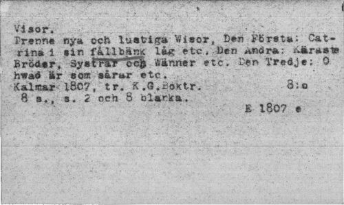 //// '¦'".* 7. * //// Vi »or. //// T-renns nya och lustiga Wisor, Don Ft> ro ta: Cat-rino i sin fållbäntc li* etc . Hen *n<är*; K&rai»te Brödor, äyair&P o^ fiännor etc. l>n Tredje; 0 hwad är o om sårar etc. //// Kalmar 1807, tr. K.G.^ofctr. 3:o //// B s,, s. 2 och 3 b lar it a . //// E 1807 t ////