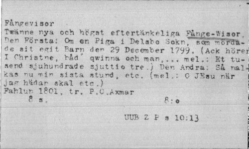 //// Pånpevisor //// Twänne nya och hcRst eftertänkéli<?a Fånge-Wisor.. nen Första; On en Pi^a i Delsbo Sokr 7 som "roFua-'de si t e*i t Barn den 29 December 1799. (Ack höre I Christ^e, "bad* qwima och man,.,, mel.: Et tu-send sjuhundrade sjuttio tre.) Den Andra; Sa nal kas ^u ni" sista «tu "d , etc. (mel.: 0 JEsu när jaf hädar skal etc.) Fafclun 1801, tr, P.C.Axmar //// ? s . B: o //// UUB Z P s 10;13 ////
