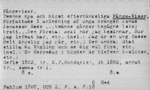//// Fångev isor„ //// Twenne nya och högst eftertänkeliga Fånga-Wiaor. Författade 1 anledning af unga drängen Jonas Jonasson Heds ..*twänne gångor begågne (sic; brott...Den Första; AckJ när jag besinnar. Hur jag lefwat har, etc.- (mel,; *ag ar en ung Gosse Helt ängslig jag går, etc.) Den ^ndra; Stat stilla au Yngling och se dig vräl före, etc. (mel-; En Herredag i hcgden är blefwen besluten, etc .) //// Gefle 1802, tr. R.P.Sundqvist, ib 1802, annat tr,, samma tr: i . //// 8 «. 8; • //// 0 Hed //// Fahlun 1807. UUR Z. P. s, P;l8 ////