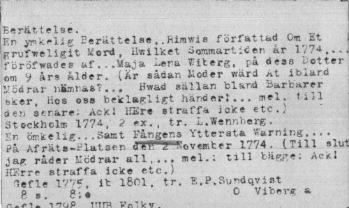 //// Berättelse. //// En ynk^lig Berättelse,.ftimwis författad Om Et grufweligit Mord, Hvsilket o ömmar t iden år 1774,.. förofwades af...Maja ^era Wiberg, på dess Dotter om V års ålder. [Är sådan Moder wärd ^t iblard 'lödrar nämnas?.., Hwad sällan bland Barbarer sker, Hos oss beklagligt händer*... mel. till den senare; Ack i HEre straffa icke etc.) Stockholm 177^, 2 ex., tr. L.Wennberg. En ömkelig.,.Samt Fångens Yttersta »Varning,... På Af rät s-P lat sen fä? T"*" o v em b e r 1774. (Till slu jap; råder Mcdrar all,... mel.: till bägge: AckJ HErre straffa icke etc.) lefle 177*, it 18OI, tr. E.P.Sundqvi st 8 s. 8;« O Viberar a ////