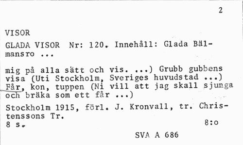 //// 2 //// VISOR //// GLADA VISOR Nr: 120.. Innehåll: Glada Bäl-mans ro ... //// mig på alla satt och vis. ,..) Grubb gubbens visa (Uti Stockholm, Sveriges huvudstad ...) Få r, kon, tuppen (Ni vill att jag skall sjunga och bräka som ett får ...) //// Stockholm 1915, förl. J. Kronvall, tr. Chris-tenssons Tr. //// 8 s , 8: o //// SVA A 686 ////