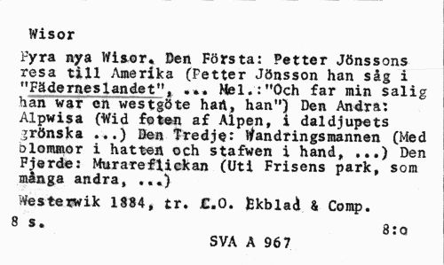 //// Wisor //// Fyra nya Wi&or* Den Första: Petter Jönssons resa till Amerika (Petter Jönsson han såg i "Fäderneslandet"t ••• Mel.:"Och far min salig han war en westgöte hart, han") Den Andra: Alpwisa (Wid foten af Alpen, i daldjupets jrönska ...) Ben Tredje: Vandringsmannen (Med Dlommor i hattea och stafwen i hand, ...) Den Fjerde: Murareflickan (Uti Frisens park, som många andra, ...) //// Westerwik 1884» tr. £.0. Ékblai & Comp. //// 8 s. 8:o //// SVA A 967 ////