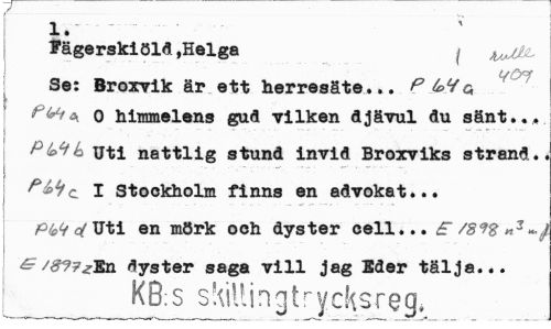 //// 1. //// Fägerskiöld,Helga j ^jjbL //// Se: Broxvik är ett herresäte... P $ PVi*. 0 hlramelens gud vilken djävul du sänt..* //// PtetL Uti nattlig stund invid Broxviks strand. //// ribc //// I Stockholm finns en advokat... PM c(\Jti en mörk och dyster cell... £ /Si% n2^^ & dyster saga vill jag Eder tälja... //// KB:S skillingtrycksreg* ////