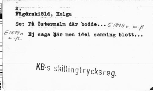 //// a. //// Fägårskiöld, Helga //// Se: På Östermalm där bodde... &/89S- „ ^ ^ //// éF/8?9n Ej saga aär men j.ael sanning blott... //// _ ^ ./t. //// ; KB.-S skillingtrycksreg. ¦ //// i l å ////