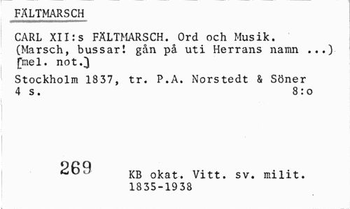 //// FÄLTMARSCH //// CARL XII:s FÄLTMARSCH. Ord och Musik. (Marsch, bussar! gån på uti Herrans namn ...) [mel. not.3 //// Stockholm 1837, tr. P.A. Norstedt & Söner 4 s . 8: o //// 269 KB okat. Vitt. sv. milit. //// 1835-19 38 ////