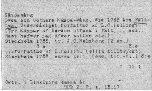 //// Kämpa sång //// ,3wea ösh (Jothers Kämpa--»ang, Wid 1786 års Fält- //// Underdånigst f örfattad Af L,-C „(ellingT""""* ffre Kämpar af Kora en utfara i f äl15 ... mel.: Rest hafwer jag öfwér *atterj etc.) SteeicholÄ 1788, t,r. J.C.H»lmherg (2 exj //// 8 a» - 8; o //// «, »författad Af L. il i r?. (ollin 11111 ryck t j St sek hel» 1788, »a-tsa tr: i. fend, tit. .«'M,j 8: é //// ¦ --r- . v.;;;vj u \ ' //// Qntr, I Llnköpi sa^Tsa år //// ¦""B 2. ?. f . \ t: 17 ////