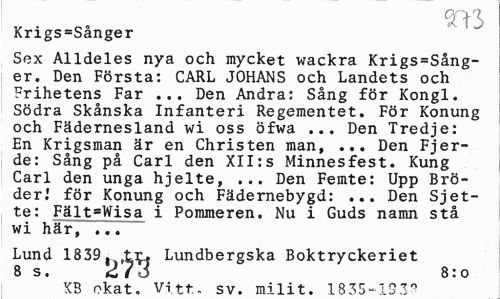 //// Krigs=Sanger //// Sex Alldeles nya och mycket wackra Krigs=Sång-er. Den Första: CARL JOHANS och Landets och Frihetens Far ... Den Andra: Sång för Kongl. Södra Skånska Infanteri Regementet. För Konung och Fädernesland wi oss öfwa ... Den Tredje: En Krigsman är en Christen man, ... Den Fjer-de: Sång på Carl den XII:s Minnesfest. Kung Carl den unga hjelte, ... Den Femte: Upp Bröder! för Konung och Fädernebygd: ... Den Sjet-te: Fält=Wisa i Pommeren. Nu i Guds namn stå wi här, //// Lund 1839, t^. Lundbergska Boktryckeriet 8 s. dt (o 8:0 //// KB okat. Vitt.. sv. milit. 1835-193° ////