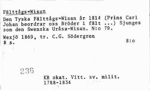//// Fälttågs »Wisan, //// Den Tyska Fälttågs=Wisan år 1814 (Prins Carl //// Johan beordrar oss Bröder i fält ...) Sjunges //// som den Swenska Uråsa-Wisan. N:o 79. //// Wexjö 1869, tr. C.G. Södergren 8 s. 8: o //// 238 //// KB okat. Vitt. sv. milit. //// 1788-1834 ////