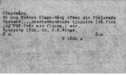 //// Klageaing. //// Sr ung Drängs Klage-Sång öfwer sin förlorade FäateraS,,« *A<J ert onirand rade tjugu tre fick jagTTTTÖ fr&r min flicka,) etc. Hykppirg 1826, tr. P.E.Winge, 8a. 8:0 //// B 1820 a //// • /.- V- -.; "•:/ • '.'.-i ' " !¦'• ¦•¦•..-«' Äi ' ////