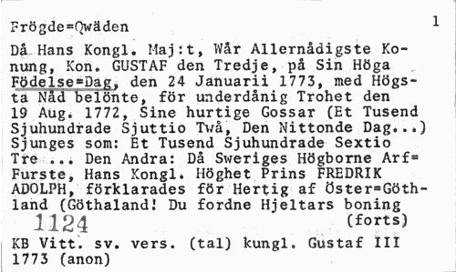 //// Frögde=Qwäden * //// Då Hans Kongl. Maj:t, Wår Allernådigste Konung, Kon. GUSTAF den Tredje, på Sin Höga Födelse»Dag, den 24 Januarii 1773, med Högsta Nåd belöhte, för underdånig Trohet den 19 Aug. 1772, Sine hurtige Gossar (Et Tusend Sjuhundrade Sjuttio Tv/å, Den Nittonde Dag..,) Sjunges som: Et Tusend Sjuhundrade Sextio Tre ... Den Andra: Då Sweriges Högborne Arfa Furste, Hans Kongl, Höghet Prins FREDRIK ADOLPH, förklarades för Hertig af öster=Göth-land (Göthalandl Du fordne Hjeltars boning 1124 (forts) //// KB Vitt. sv. vers. (tal) kungl. Gustaf III 1773 (anon) ////