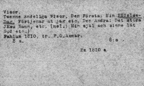 //// Vi«or. //// Twenne Andeliga Wisor, Den Första; Min FSdela*- //// Fbrt j enar at ja g etc. Den Andra; PetsTors //// JEsu Namn, etc. (mel.; Min sjal och sinne lät uud etc.) //// Fahlua 1810, tr. P.C.Axmar. //// 6 »• 8;o . //// ZSR 1610 * ////