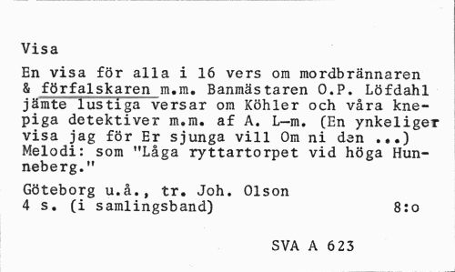 //// Visa //// En visa för alla i 16 vers om mordbrännaren & förfalskaren m.m. Banmästaren O.P. Löfdahl jämte lustiga versar om Köhler och våra kne-piga detektiver m.m. af A. L-m. (En ynkeliger visa jag för Er sjunga vill Om ni den ...) Melodi: som "Låga ryttartorpet vid höga Hunneberg." //// Göteborg u.å., tr. Joh. Olson 4 s. (i samlingsband) 8:0 //// SVA A 6 8 ////