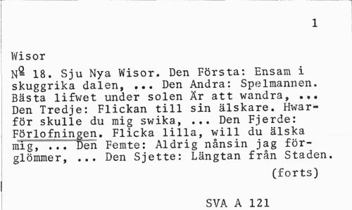 //// 1 //// Wisor //// N- 18. Sju Nya Wisor. Den Första: Ensam i skuggrika dalen, ... Den Andra: Spelmannen. Bästa lifwet under solen Är att wandra, ... Den Tredje: Flickan till sin älskare. Hwar-för skulle du mig swika, ... Den Fjerde: Förlofningen. Flicka lilla, will du älska mig, ... Den Femte: Aldrig nånsin jag förglömmer, ... Den Sjette: Längtan från Staden. //// (forts) //// SVA A 1 ? 1 ////