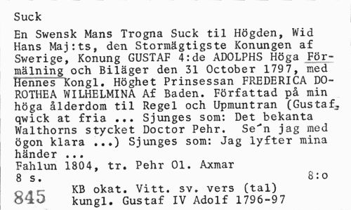 //// Suck //// En Swensk Mans Trogna Suck til Högden, Wid Hans Maj:ts, den Stormägtigste Konungen af Swerige, Konung GUSTAF 4:de ADOLPHS Höga För-mälning och Biläger den 31 October 179 7, med hennes Kongl. Höghet Prinsessan FREDERICA D0-ROTHEA WILHELMINA Af Baden. Författad på min höga ålderdom til Regel och Upmuntran (Gustaf^ qwick at fria ... Sjunges som: Det bekanta Walthorns stycket Doctor Pehr. Se"n jag med ögon klara ...) Sjunges som: Jag lyfter mina händer ... //// Fahlun 1804, tr. Pehr 01. Axmar 8 s. 8:o //// ( T- KB okat. Vitt. sv. vers (tal) o£D kungl. Gustaf IV Adolf 1796-97 ////