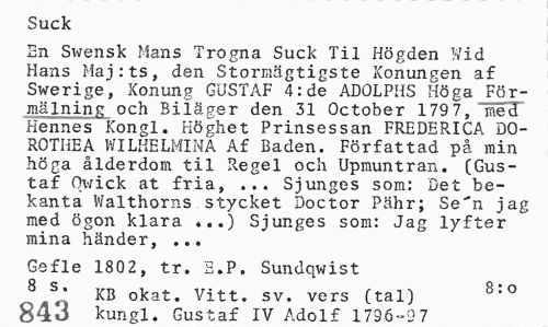 //// Suck //// En Swensk Mans Trogna Suck Til Högden Wid Hans Maj:ts, den Stormägtigste Konungen af Swerige, Konung GUSTAF 4:de ADOLPHS Höga För-mälning och Biläger den 31 October 179 7, med Hennes Kongl. Höghet Prinsessan FREDERICA D0-ROTHEA WILHELMINA Af Baden. Författad på min höga ålderdom til Regel och Upmuntran. (Gustaf Owick at fria, ... Sjunges som: Det bekanta Walthorns stycket Doctor Pähr; Se'n jag med ögon klara ?..) Sjunges som: Jag lyfter mina händer, ... //// Gefle 1802, tr. E.P. Sundqwist //// 8 s' KB okat. Vitt. sv. vers (tal) 8:0 //// 843 kun el. Gustaf IV Adolf 1796-9 7 ////