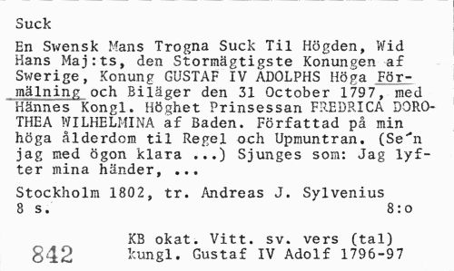 //// Suck //// En Swensk Mans Trogna Suck Til Högden, Wid Hans Maj:ts, den Stormägtigste Konungen af Swerige, Konung GUSTAF IV ADOLPHS Höga För-mälning och Biläger den 31 October 1797, med Hannes Kongl. Höghet Prinsessan FREDRICA 30R0-THEA WILHELMINA af Baden. Författad på min höga ålderdom til Regel och Upmuntran. (Se"*n jag med Ögon klara ...) Sjunges som: Jag lyfter mina händer, ... //// Stockholm 1802, tr. Andreas J. Sylvenius 8 s. 8:o //// 8 s' KB okat. Vitt. sv. vers (tal) 8:0 //// 842 kun el. Gustaf IV Adolf 1796-9 7 ////