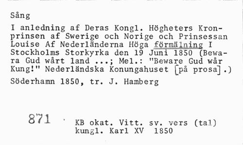 //// Sång //// I anledning af Deras Kongl. Högheters Kronprinsen af Swerige och Norige och Prinsessan Louise Af Nederländerna Höga förmäining I Stockholms Storkyrka den 19 Juni 1850 (Bewa-ra Gud wårt land Mel.: "Beware Gud wår //// Kung!" Nederländska Konungahuset £på prosa].) //// Söderhamn 1850, tr. J. Hamberg //// 871 KB okat. Vitt. sv. vers (tal) //// kungl. Karl XV 1850 ////