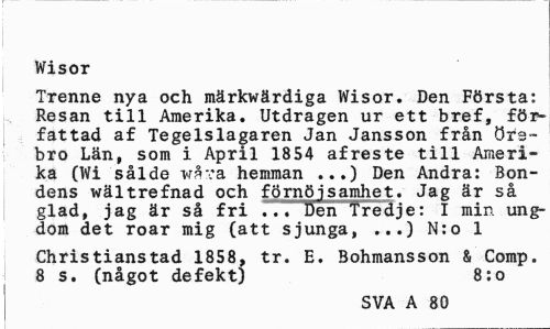 //// Wisor //// Trenne nya och märkwärdiga Wisor. Den Första: Resan till Amerika. Utdragen ur ett bref, författad af Tegelslagaren Jan Jansson från Örebro Län, som i April 1854 afreste till Amerika (Wi sålde wåva hemman ...) Den Andra: Bondens wältrefnad och förnöjsamhet. Jag är så glad, jag är så fri ... Den Tredje: I min ungdom det roar mig (att sjunga, ...) N:o 1 //// Christianstad 1858, tr. E. Bohmansson & Comp. 8 5. (något defekt) 8:o //// SVA A 80 ////