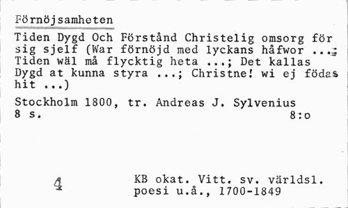 //// Förnöjsamheten //// Tiden Dygd Och Förstånd Christelig omsorg för sig sjelf (War förnöjd med lyckans håfwor .. Tiden wäl må flycktig heta ...; Det kallas Dygd at kunna styra ...; Christne! wi ej födas hit ...) //// Stockholm 1800, tr. Andreas J. Sylvenius 8 s. 8:0 //// a KB okat. Vitt. sv. världsl. //// * poesi u.å., 1700-1849 ////