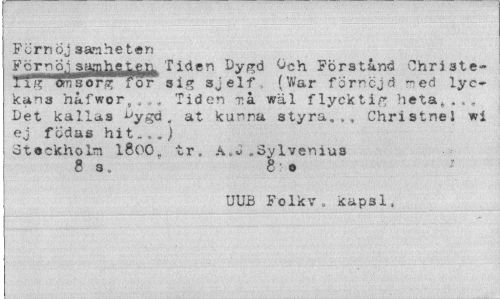 //// P U rr» Ö j san h e t e n //// Förnöjsamhet^ Tiden Dygd Och Förstånd Christe-11 om s or,7 for sig s^elf (War fornejd -ea lyckans hafwor, .. . Tiden rå wäl flycktip; heta,»,. Det kallas ^ygd. at kunra styra.,, Christnei wi ej f ijdas hit...) //// Stockholm 1800„ tr. A.oSylvemus 8 a. 8 o //// UUB Folkv. kapsl, ////