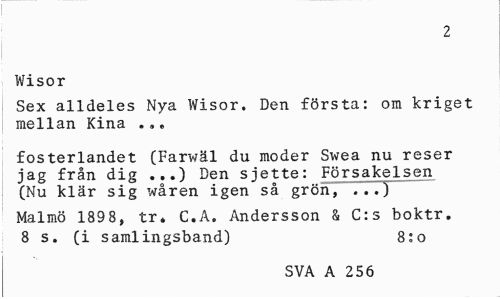 //// 2 //// Wisor //// Sex alldeles Nya Wisor. Den första: om kriget mellan Kina ... //// fosterlandet (Farwäl du moder Swea nu reser jag från dig ...) Den sjette: Försakelsen (Nu klär sig wåren igen så grön, ...) //// Malmö 1898, tr. C.A. Andersson & C:s boktr. 8 s. (i samlingsband) 8:o //// SVA A 256 ////