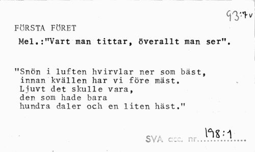 //// FÖRSTA FÖRET //// Mel.:"Vart man tittar, överallt man ser". //// "Snön i luften hvirvlar ner som bäst, innan kvällen har vi före mäst. Ljuvt det skulle vara, den som hade bara hundra daler och en liten häst." //// 3 V .A» C." --Ca Of...»e.l^sM»» ////