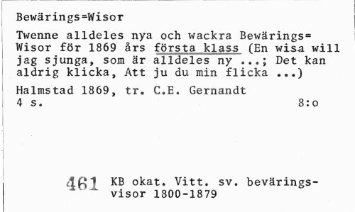 //// Bewärings=Wisor //// Twenne alldeles nya och wackra Bewärings= Wisor för 1869 års första klass (En wls-a will jag sjunga, som är alldeles ny Det kan //// aldrig klicka, Att ju du min flicka ...) //// Halmstad 1869, tr. C.E. Gernandt 4 s. 8:o //// 4 C O XB okat. Vitt. sv, bevärings- //// a ' ' visor 1800-1879 ////