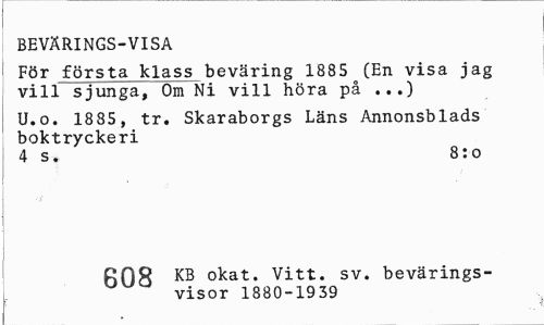 //// BEVÄRINGS-VISA //// För första klass beväring 1885 (En visa jag vill sjunga, Om Ni vill höra på ...) //// U.o. 1885, tr. Skaraborgs Läns Annonsblads boktryckeri //// 4 s. 8:o //// I //// 08 KB okat. Vitt. sv. bevärings- //// visor 1880-1939 ////