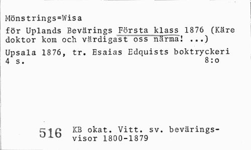 //// Mönstrings=Wisa //// för Uplands Bevärings Första lclass 1876 (Käre doktor kom och värdigast oss närma! ...) //// Upsala 1876, tr. Esaias Edquists boktryckeri 4 s. 8 :o //// 4 C O XB okat. Vitt. sv, bevärings- //// a ' ' visor 1800-1879 ////