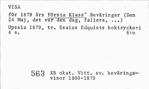 //// VISA //// för 1879 års Första Klass"* Beväringar (Den //// 24 Maj, det var den dag, fallera, ...) //// Upsala 1879, tr. Esaias Edquists boktryckeri 4 s. 8:o //// 563 KB Vitt. sv. bevärings- //// ~ visor 1800-1879 ////